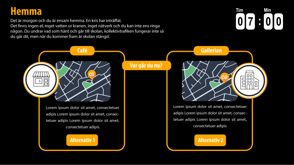 Everyday Life in Crisis – Is an interactive touch station where the user gets a scenario of an emergency disaster and different choices to handle the situation. Depending on the choices made, they end up on different paths that lead them to the end of the ”story”.