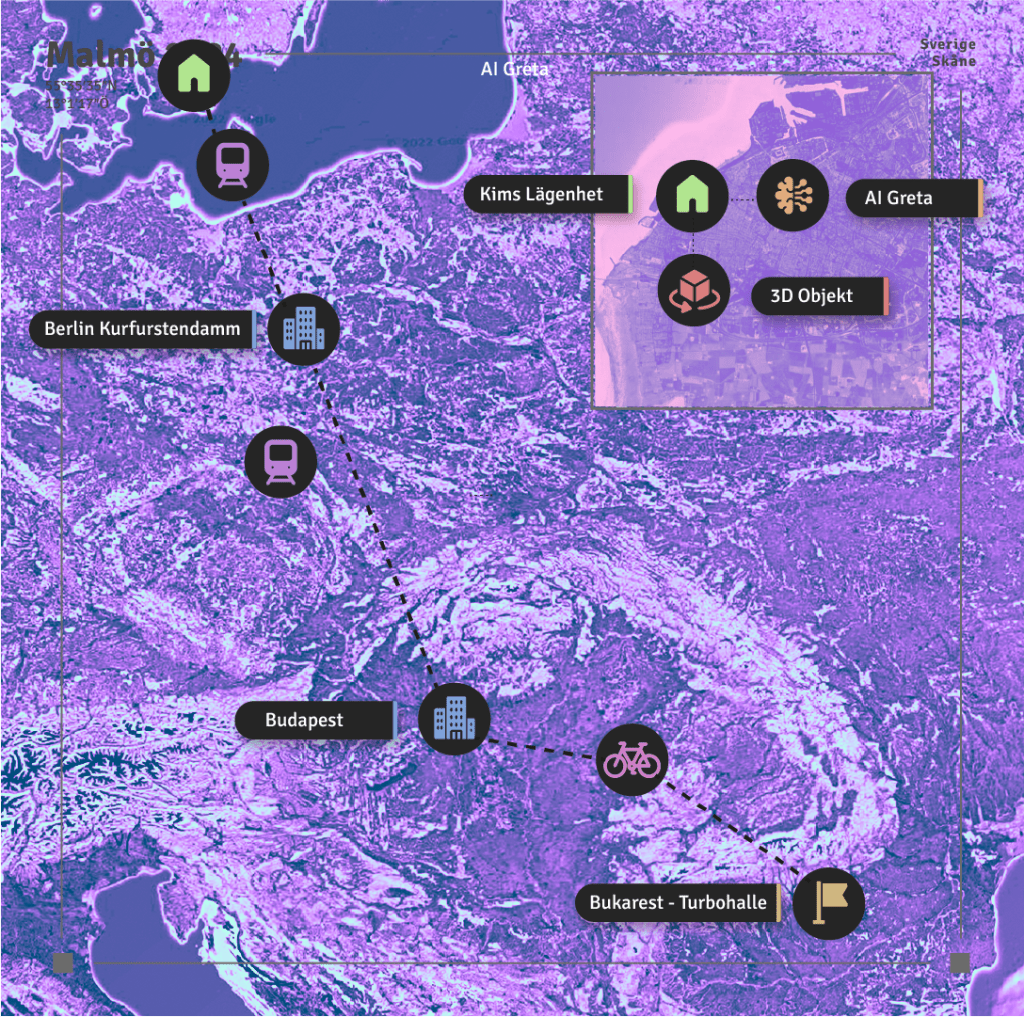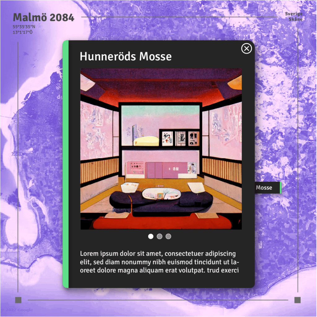 To Malmö museum’s exhibition 2084 – Kim’s World, me and the team were tasked with developing materials in the form of GUIs and illustrations made by AI for 8 different chapters and 30 screens.