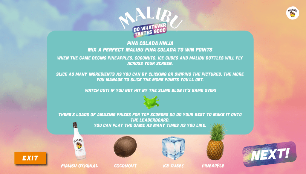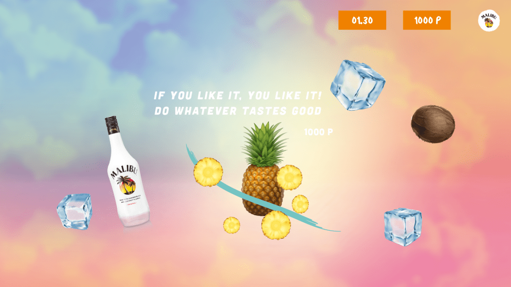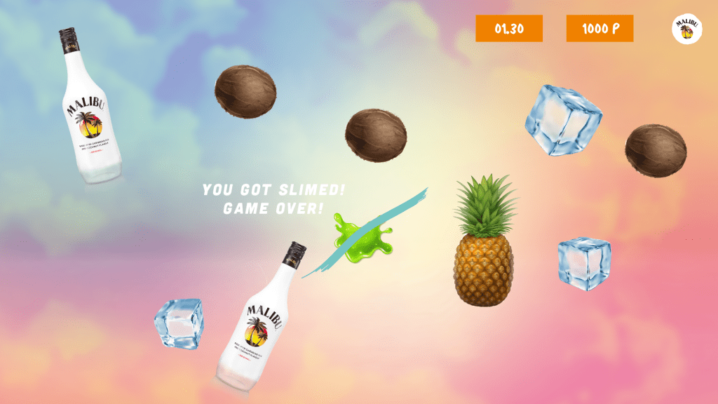 THE PROJECT – Slice the right ingredients and mix for the perfect Malibu Piña Colada drink – Malibu Original, pineapple, ice, and coconuts! If you touch the green slime, it’s GAME OVER! The ingredients fall from the sky faster and faster, and more and more slimes enter the screen. When you slice the fruits, the slices appear and positive Malibu brand lyrics pop up!