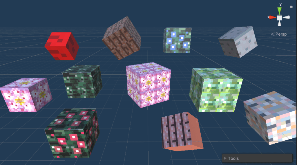 For my Unity enviorment I created blocks with different textures to build bricks, grass, sand and flowers. I created the pixel textures in illustraitor and then wrapped 3D cubes directly in Unity. This way I could build prefabs ready to use and create my 3D envirorment.