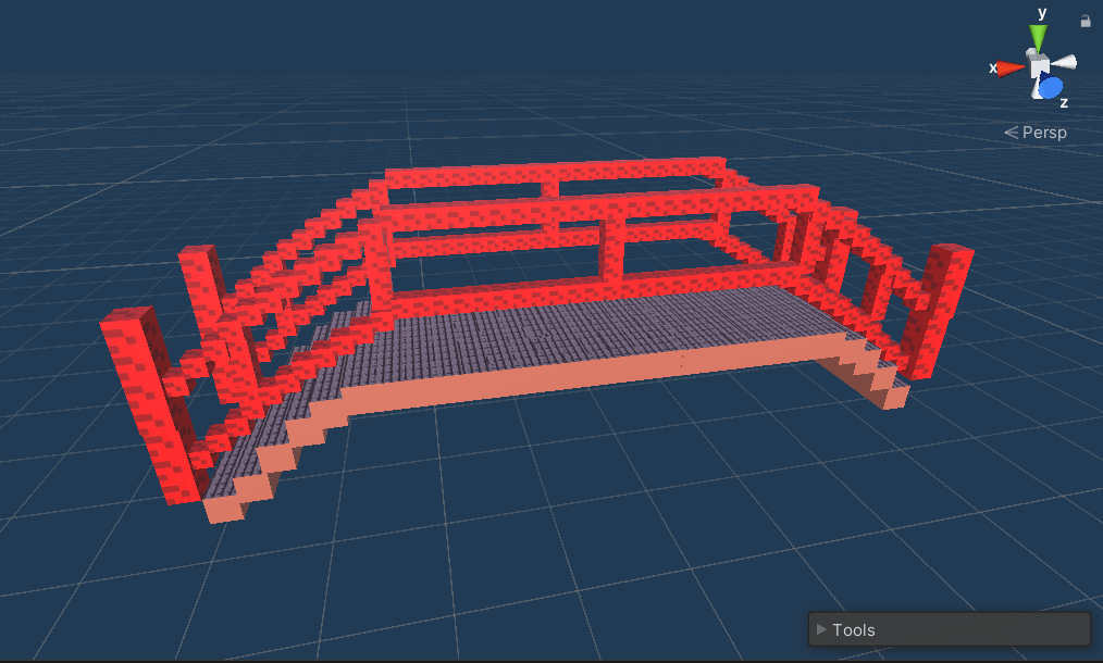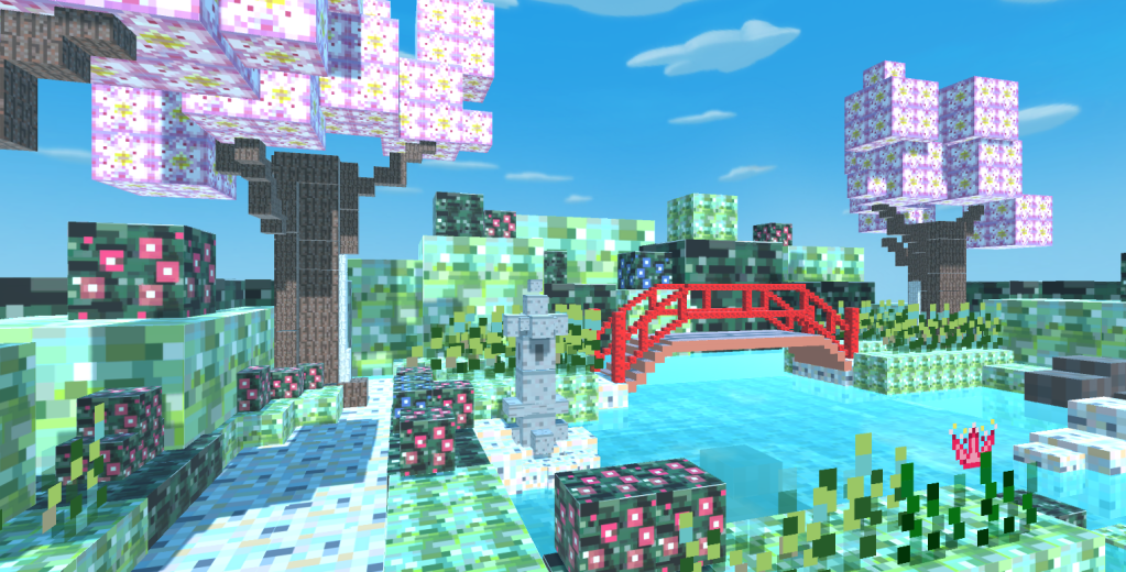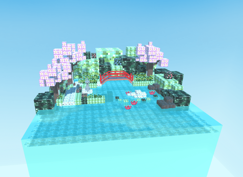 Every litle cube combined and built as a 3D japanese bridge built like a classic Minecraft enviorment.